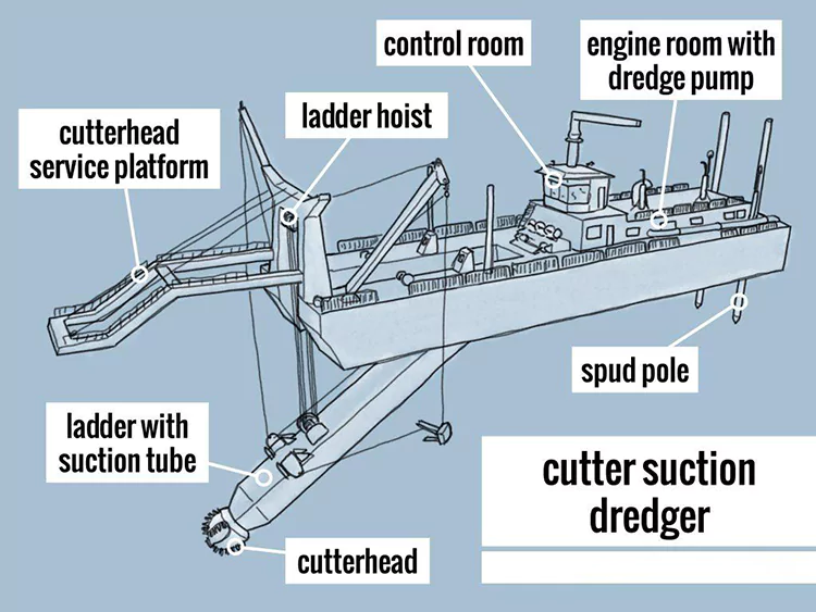 سیستم کاتر: در قسمت جلویی دستگاه کاتر مارپیچی تعبیه شده است که با چرخش با سرعت زیاد شن و ماسه رودخانه ها را شل و خرد می کند و برای انواع خاک مانند ماسه، رس و سنگ مناسب است.